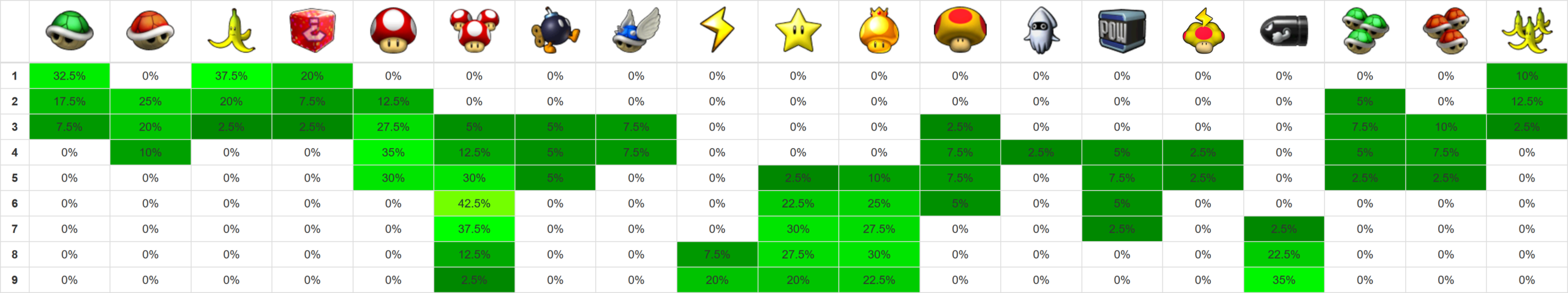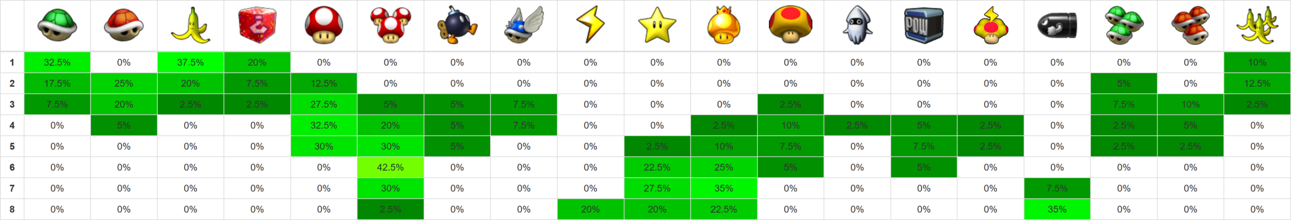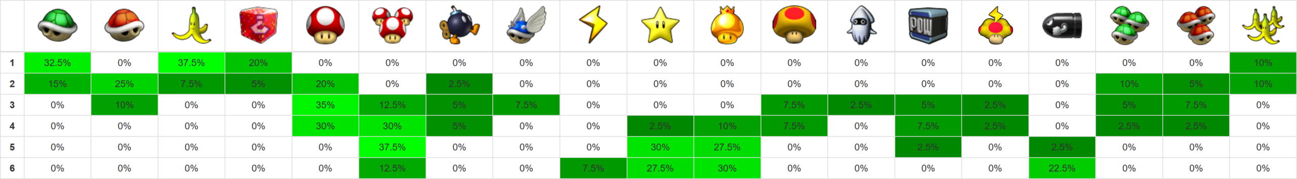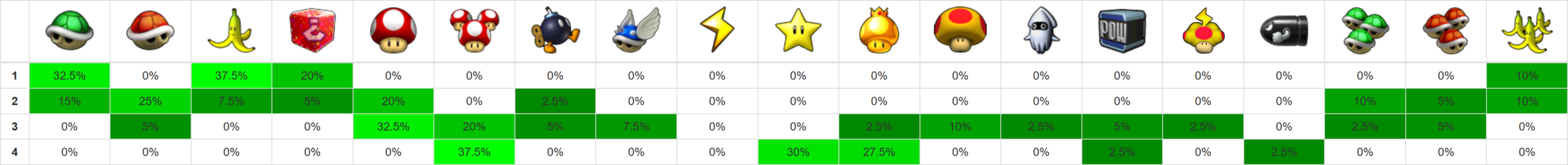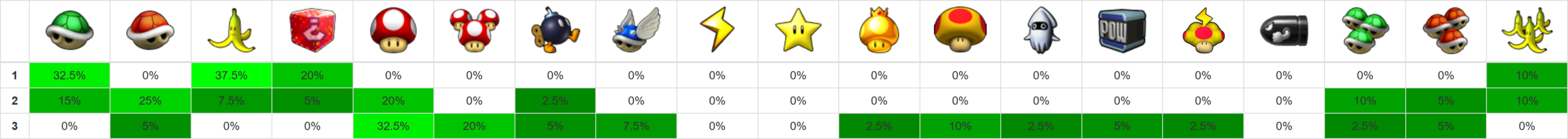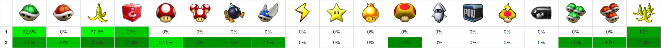 Credits for layout: xer.fr/mkw (vanilla item probabilities) Edited by me for Retro Rewind.