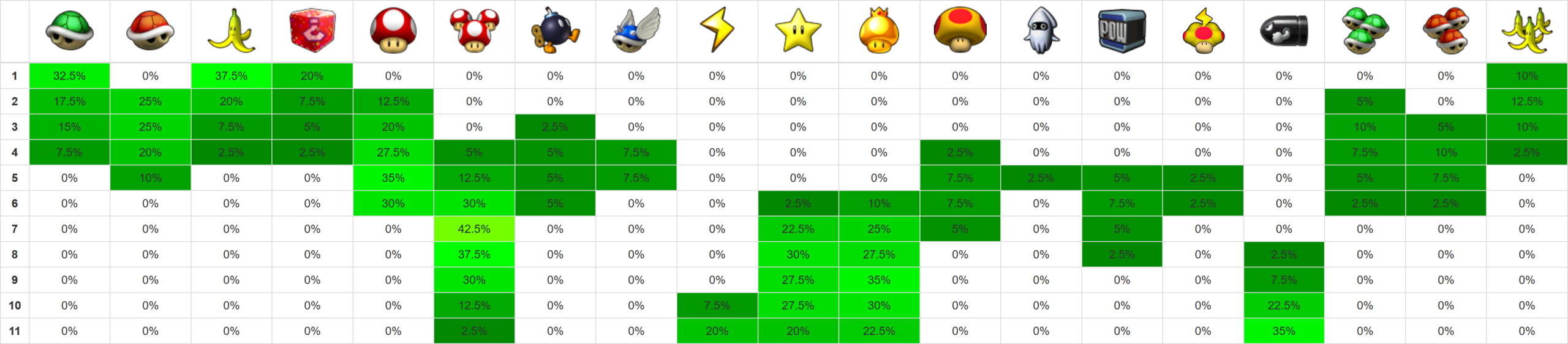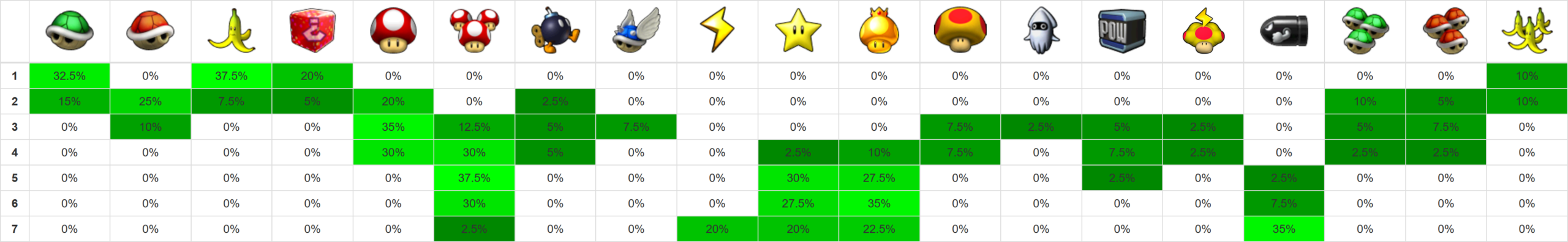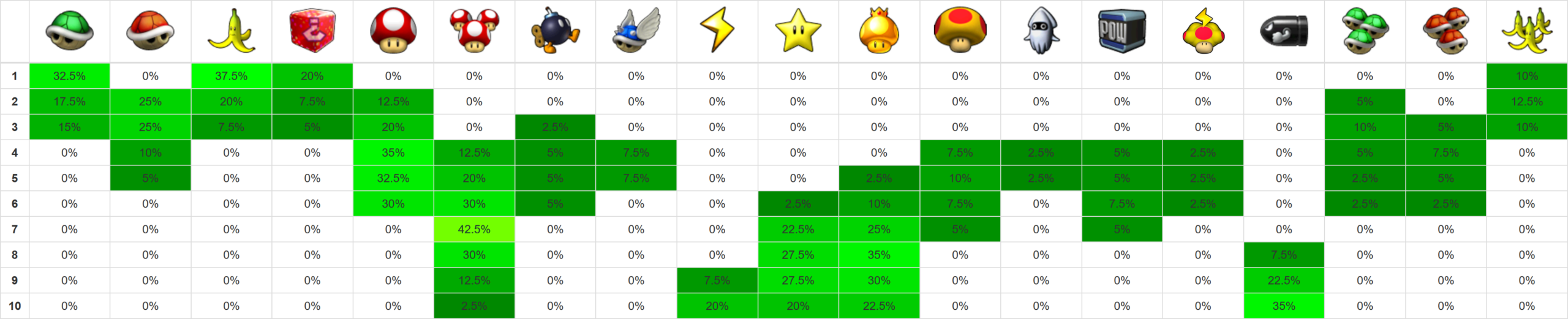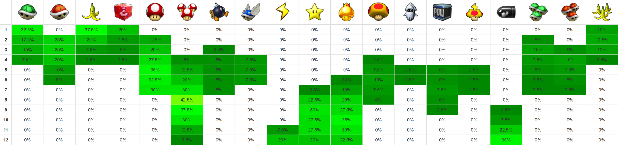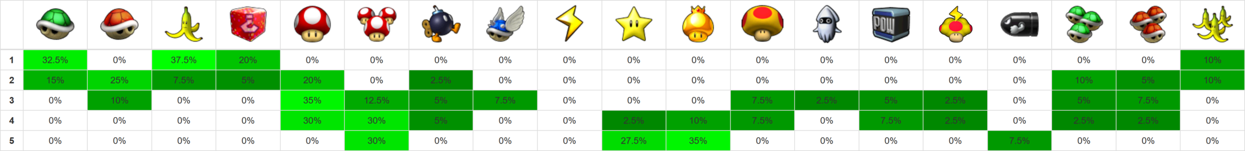 Credits for layout: xer.fr/mkw (vanilla item probabilities) Edited by me for Retro Rewind.